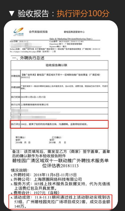 原圈在碧桂园合作方验收报告上给原圈科技打上了100分